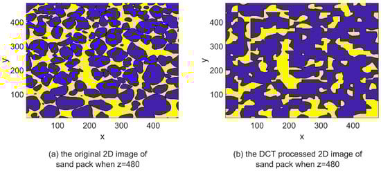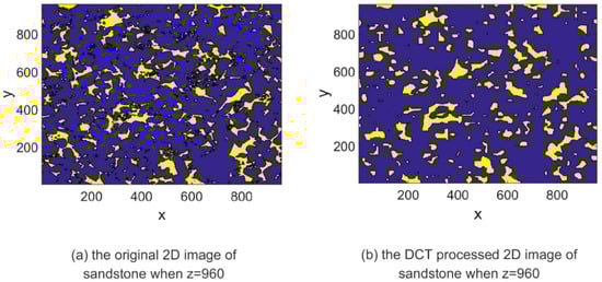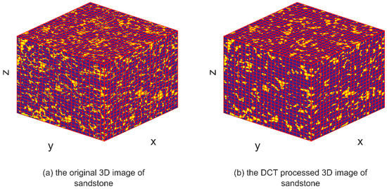Continuing to Figure 5 and Figure 6, the sandstone sample is showcased. Similarly, the left image represents the original digital rock image, while the right image corresponds to the DCT-processed version. The utilization of DCT in this case aims to enhance the contrast between the pores and the matrix, enabling a clearer differentiation between these two elements. Upon comparing the two images, it can be observed that the pore structure characteristics of sandstone remain unchanged before and after the DCT treatment.