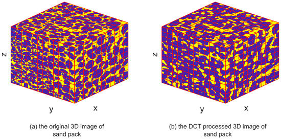 DCT is a mathematical technique used to transform a signal or image from the spatial domain to the frequency domain. IDCT can be used to convert the signal back to its original time-domain representation after it has undergone DCT processing, thereby restoring its original form and spatial distribution. The IDCT equations, represented by Equations (4) and (8), facilitate the restoration of the transformed signal obtained through DCT processing. By applying the IDCT, the transformed signal can be reverted to its original time-domain representation, ensuring the preservation of its inherent characteristics and quality, similar to the original signal. The images depicting the IDCT processing results are shown on the right side of Figure 3, Figure 4, Figure 5, Figure 6, Figure 7 and Figure 8. These figures show the shale, sandpack and sandstone images. In the pictures, the dark points express the matrix, and the bright colors show the pores. The shale, sandpack and sandstone samples were segmented into smaller cubes. Subsequently, the 3D-DCT technique was applied to each of these smaller cubes. Upon applying the DCT to the digital rock images of shale, sandpack and sandstone, which is known for its nanoscale pore structures, 3D and 2D visualizations were generated to compare the morphological characteristics and spatial distribution of pores and matrix before and after transformation.