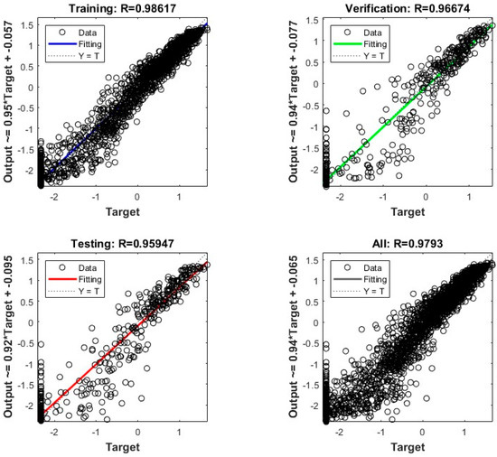 The target or actual permeability is computed using LBM, running the calculation through the Taichi toolkit, directly as a reference. Based on the determined parameters for the DCT and the ANN, the shale permeability prediction model, incorporating the effect of nanoscale elements, exhibits excellent fitting performance. The model’s performance was evaluated by calculating the determination coefficient R between the predicted and actual permeabilities in the z-direction using both the training and testing datasets. In Figure 9, a comparison is presented between the training, validation, and testing data for both the numerical and ANN results. The performance curve illustrates a clear correlation between the numerical and expected outcomes, highlighting the accuracy achieved through model training. The obtained correlation coefficient of 0.98 for the training dataset indicates a strong agreement between the predicted shale permeability values, considering the presence of nanoscale elements, and the actual observed values. This result highlights the model’s ability to effectively capture the intricate influence of nanoscale elements on shale permeability.