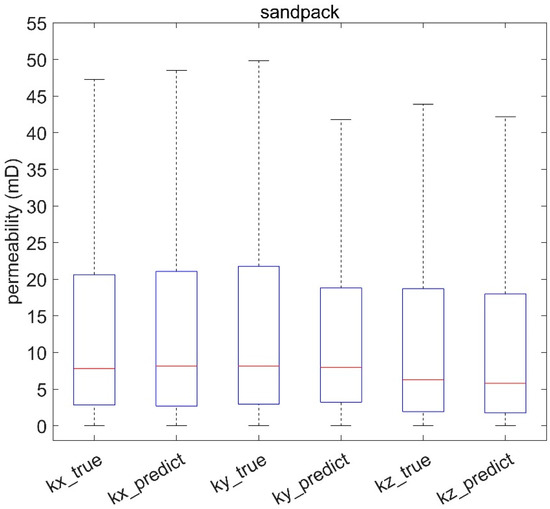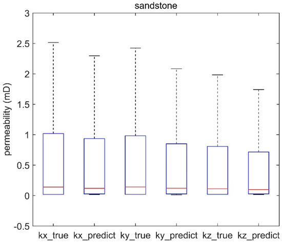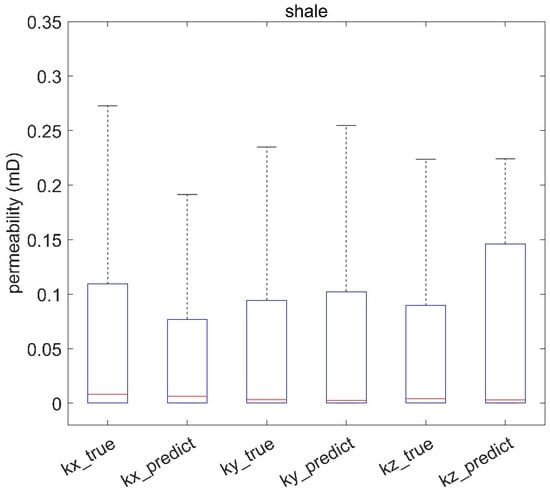 The predictive models for rock permeability showed a high degree of agreement with the true values in Figure 10, Figure 11 and Figure 12, even at the nanoscale (Figure 10). Boxplots illustrate the performance of the permeability prediction models across different scales. Each plot compares the true permeabilities (labeled as “kx_true”, “ky_true”, “kz_true”) and the predicted permeabilities (labeled as “kx_predict”, “ky_predict”, “kz_predict”) for each model. The central red line within each box represents the median value, the box contains the interquartile range, and the “whiskers” represent the overall range of the data.