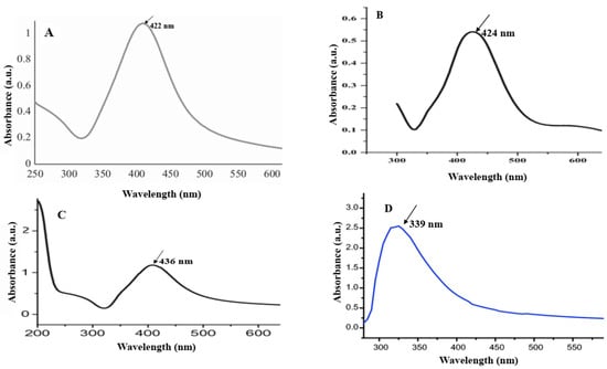 Firstly, the formation of NPs was confirmed using the UV/Vis technique. Metal NPs have their characteristic surface plasmon resonance (SPR) peaks. For example, the SPR peak of silver NPs appears between 400 and 450 nm. This value for CuONPs is 250–350 nm. As shown in Figure 2, the SPR peaks of AgNPs A, B, and C appeared at 422, 424, and 436 nm, respectively. This variation in peak position is related to the size and shape of NPs. Furthermore, a peak at 339 nm was observed in the UV/Vis spectrum of CuONPs, which confirmed the presence of CuONPs [,].