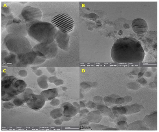 Characterization of these NPs using SEM analysis confirmed a rather spherical morphology for NPs. Moreover, the size range of nanoparticles A, B, C, and D was 15–36, 29–61, 20–38, and 4–28 nm, respectively (Figure 3). A comparison of the size range of synthesized AgNPs using DPA showed that nanoparticles synthesized using crude DPA (B) were smaller than nanoparticles synthesized by commercial DPA (C). The size range of synthesized NPs using bacterial spore and its derivatives (in current study) was similar to that of NPs synthesized using other biological methods. For instance, the size range of AgNPs synthesized by Carica papaya peel extract, Aspergillus terreus, and Azotobacter vinelandii was reported to be 28, 1–20, and 20–70 nm, respectively [,,]. In addition, TEM analysis showed that synthesized NPs mainly were of spherical shape and aggregated. AgNPs B were more dispersed (Figure 4). Further analysis of the synthesized NPs was performed using EDS. According to the results, strong signal peaks were observed near 3 keV (Figure 5A–C) which proved the presence of AgNPs []. Furthermore, the strong peaks near 1 and 8 keV confirmed the formation of CuONPs.