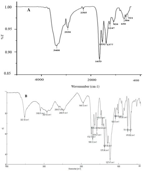 Analysis of functional groups of synthesized NPs was performed using FTIR. FTIR spectrum of AgNPs A showed several peaks at positions 3400, 2930, 1653, 1377, 1247, 826, and 650 cm−1 that were attributed to O–H, C–H, O=C=O, N–H, C–H, C–O, C=CH2, and –CH=CH groups, respectively. Furthermore, the band at 1532 cm−1 was assigned to a combination of N–H deformation and C–N stretching vibrations. The peaks at 584 and 521 cm−1 were assigned to AgO (Figure 6A). The FTIR spectrum of AgNPs B showed peaks at 2921 cm−1, 1732 cm−1, and 1375 cm−1, which confirmed the formation of AgNPs (Figure 6B). The FTIR spectrum of AgNPs C showed peaks at 2934 cm−1, 1656 cm−1, 1381 cm−1, and 1121 cm−1, which were attributed to C–H stretching, C=O group, C–C (or C–N) stretching, and O–H stretching, respectively. These bonds confirmed the presence of AgNPs (Figure 6C). The FTIR spectrum of CuONPs (Figure 6D) showed several peaks at 1656 cm−1, 1384 cm−1, 1113 cm−1, 765 cm−1, and 618 cm−1, which were assigned to O–H bending, C–O asymmetric in the structure of CuONPs, C–O symmetric in the structure of CuONPs, and Cu–O stretching vibration, respectively [,].