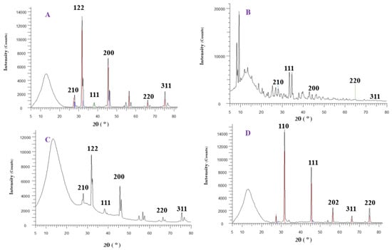 XRD pattern of synthesized silver NPs A (A), B (B), and C (C), and copper oxide NPs (D).