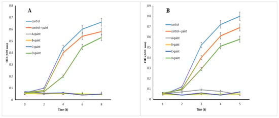 Antibacterial effects of NP–paint complexes on E. coli (A) and S. aureus (B).