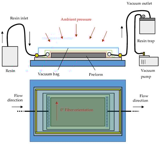 The fibers were infiltrated with the resin-hardener system (RIMR 135/RIMH 137; SikaCR83/CH83-10) by the vacuum-assisted resin infusion VARI (Figure 1). The VARI manufacturing process is conducted in a closed system (vacuum bag): the depression is generated by a vacuum pump to evacuate the textile preform. The ambient pressure leads the resin to flow into and through the dry carbon fiber fabric (preform) and also to an even compression of the textile preform during the infusion and the subsequent cure. Through prior experimental testing, it was concluded that infiltrating the fibers with resin perpendicular rather than parallel to the fiber orientation resulted in a better resin flow and thus better composite quality. Therefore, the resin inlet and vacuum outlet were positioned as seen in Figure 1.