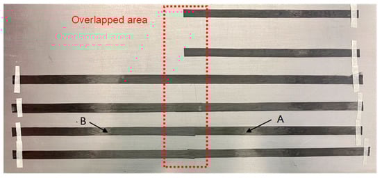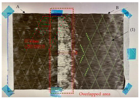 Placing and securing of the overlapped carbon fiber tows A: parent material and B: overlapping ‘patch-material’.