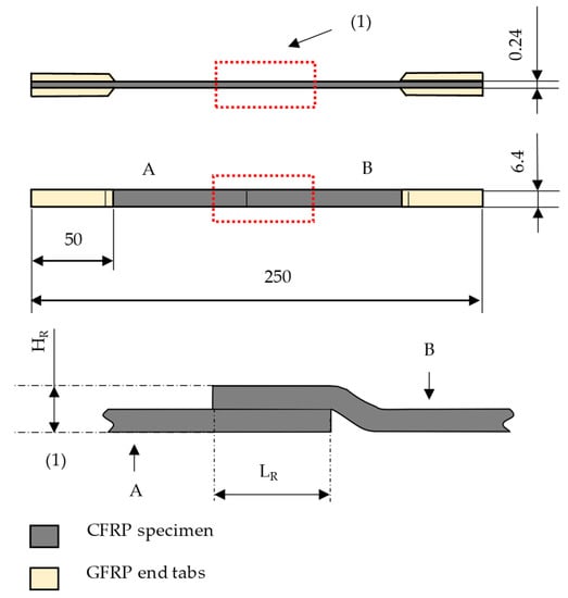 Finished CFRP specimen (OL1, OL2, OL3, OL4): the red dotted square shows the overlapping area which is shown from the top and from the side and is magnified in (1). (1) Magnified side view of the overlap. Repair height, HR. Overlap length, LR.