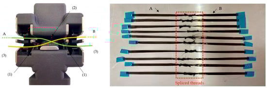 CF thread placement in the air splicer (left)—cutting blades (1), splicing chamber (2), excess material (3) of A: green line and B: yellow line. Spliced carbon fiber threads prior to infiltration (right).