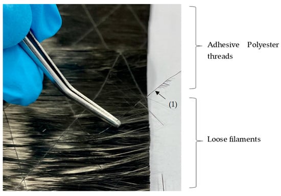 Removal of polyester threads from the CF UD-NCF at the overlapping ends of the fabric. (1) Polyester adhesive thread.