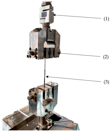 The tensile testing (DIN EN ISO 527) [23] was carried out with the universal testing machine Z100 (ZwickRoell, Ulm, Germany). For the specimen of Composite A—tow, a 10 kN force sensor and vise tensile grips were implemented (setup 1, Figure 8). For Composite B (single-layered UD), C (multiple layered) and D (multiple layered 2), the standard force sensor, 100 kN, and hydraulic vice (DEMGEN, profile: sawtooth) were used (setup 2, Figure 9). For all tensile testing specimens, the same machine parameters were used: 150 mm clamping length at start position, 5 N preloading, 2 mm/min testing speed. The young modulus was measured using a clip-on extensometer between 0.05% and 0.25% strain.