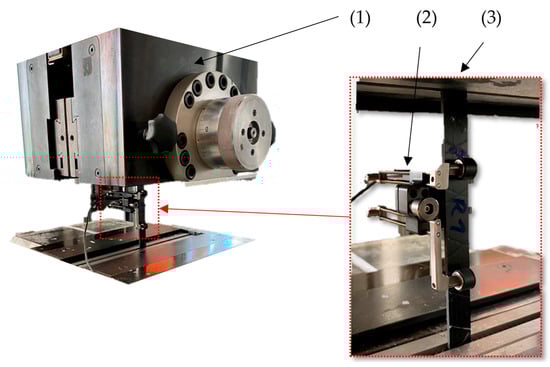 Setup 2 of the tensile testing on the Z100—hydraulic grip (1), clip-on extensometer (2), specimen (3).