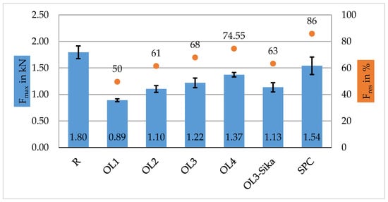 For the first series, Composite A—tow, there is a direct correlation between the length of the overlap and the breaking force of the specimens: the longer the overlap length, the higher the resulting breaking force Fmax of the specimen (cf. Figure 10). The specimens of the CF-roving (R) infused with reference resin show a breaking force of 1.8 kN. The overlapped specimens show lower breaking forces: OL1 on average 0.9 kN, OL2 on average 1.1 kN, OL3 on average 1.2 kN, OL3 with the second matrix system from Sika 1.1 kN, OL4 1.4 kN and SPC on average 1.5 kN (Figure 10). Relative to the reference specimens (R), this corresponds to the normalized residual strength Fres 49.6%, 61.5%, 67.9%, 63.2%, 74.6% and 85.8% of the achievable normalized residual strength (Fres). The comparison of two different matrix systems leads to the result that the specimen infused with the standard matrix system for this study RimR135/RIMH137 (Hexion) showed around 7% higher breaking forces than the comparative matrix system from Sika.