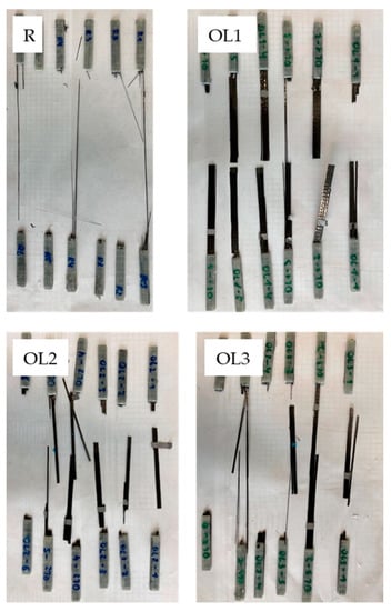 The images of the broken specimens (Figure 11, R, OL1–OL3) also reveal that when the overlap length increases, so does the contribution of the fibers to resist against the applied tensile force. The reference samples (R, cf. Figure 11) are completely ‘exploded’, all filaments flew away at the moment of the fracture. The reason for this behavior is the high degree of use of fiber strength. When failing, the sample snaps back, and at the GFRP end taps, there is a second fracture, so that the impregnated roving sample splinters. The higher the degree of fiber strength use, the more the samples splinter. For example, OL1 specimens fractured mainly at the overlap area, leaving the carbon fiber tows relatively unaffected. Thus, the potential strength of the carbon fibers was underused. Meanwhile, OL2 and OL3 show a more emphasized adherend fracture on top of the adhesive fracture, which can be correlated to a higher degree of force transmission through the fibers and therefore a higher resistance against the applied load. The higher the overlap length of the OL specimen (OL1–OL4), the more the broken specimens look like the reference. The fractured spliced samples (SPC) look like the reference; meanwhile, they show the highest breaking forces in between the repair-representing specimen.