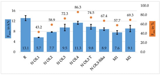 Results of Composite B—single layered: R: reference. N OL1: 5 mm overlap. N OL2: 10 mm overlap. N OL3: 20 mm overlap. N OL3T: 20 mm overlap with thread. OL3-Sika: 20 mm overlap with second matrix system Sika. M1: 20 mm overlap with modified edge geometry (Type 1). M2: 20 mm overlap with modified geometry (Type 2). OL4: 40 mm overlap.