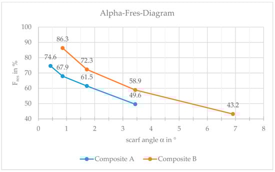 Relationship between scarf angle and residual breaking force of the repaired specimens: Composite A (blue) and Composite B (orange). Fres: residual breaking force. α: scarf angle.