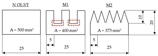 The specimens with modified edge geometry (M1, M2) show a slightly lower residual strength percentage than the specimens without edge geometry modification: 57.7% (M1) and 69.3% (M2). This may be because the surface area of the overlap of the specimens without modification is bigger than the surface area of the specimens with modification (cf. Figure 15). Moreover, despite M2 having a slightly lower surface area, it is about 12% stronger than M1. It can be assumed that due to the two wider stress spike locations (marked in red; Figure 15), the specimens of M1 have a lower breaking force. Another observation is that M1 has similar residual breaking force values to the specimens without edge geometry modification at an overlap length of 10 mm (N OL2). The weakest link of M1 is also located at 10 mm, and possibly, the debonding starts here. Conversely, M2 may have a more gradual and uniform stress distribution throughout the width of the specimen due to its geometry. Nevertheless, an FEM analysis would be necessary to reveal how the stress distributes throughout the repair width.