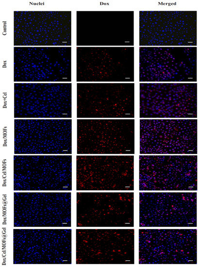 Local cancer therapy using several drugs is a revolutionary treatment strategy for enhancing therapeutic molecules’ persistent administration that successfully reduces tumor growth. One of the potential advantages of MOFs is the co-loading properties of medicines. In one study, Tan et al. developed a hybrid nanocomposite using thermosensitive hydrogels and metal-organic frameworks (MOFs) to create an injectable implant. To treat locally advanced oral cancer, doxorubicin and celecoxib were coloaded into the system (Dox/Cel/MOFs@Gel). In the lab, utilizing several kinds of oral cancer cells, including SCC-9 and KB, it was discovered that the platform could absorb a sizable amount of the medication and release it uniformly and pH-dependently. The researchers used a cell line containing free Dox and various Dox formulations (free, free + Cel, Dox/MOFs, Dox/Cel/MOFs, and Dox/MOFs) to study oral cavity cancer cells. It was found that Dox/MOFs and Dox/Cel/MOFs had different intracellular fluorescence than free Dox and Dox/MOFs, indicating that MOFs may improve the internalization of the Dox-loaded system in comparison to free Dox (Figure 9) [115]. The synergistic actions of Cel and Dox led to the nanocomposites’ exceptional tumor suppression effectiveness in vivo, which resulted in tumor death and controlled tumor angiogenesis [146].