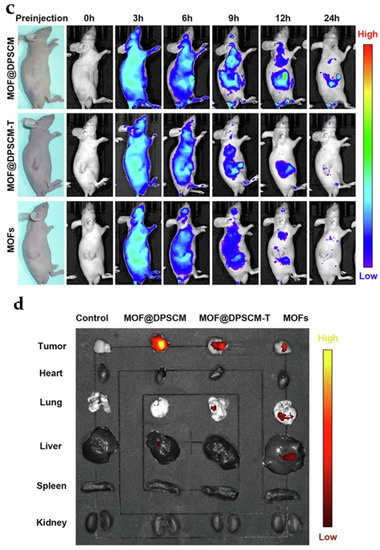 CAL27 cells are used to compare internalization between MOFs and MOF@DPSCM. (a) Confocal scanning light microscopy (CSLM) images. (b) Analysis using flow cytometry of CAL27 cells treated with MOF@DPSCM or FITC-labeled MOFs. As a control, cells were treated without any nanoparticles. Biodistribution of MOFs, MOF@DPSCM-T, and MOF@DPSCM in vivo. (c) After various intervals of time, intravenous administration of MOFs, MOF@DPSCM-T, and MOF@DPSCM labeled with Cy7, animals with CAL27 tumors were photographed in vivo in real-time with live fluorescence. (d) Ex vivo images of the animals in the central tissues of (a). As a control, the mice received PBS injections [116], Copyright © 2023, Elsevier.