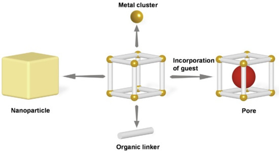 MOFs are crystalline porous solids constructed by stitching together inorganic polynuclear clusters known as secondary building units (SBUs) and organic linkers via strong bonds. Based on the results of studies conducted in recent years, metal-containing SBUs are primarily finite units in which the junctions where they are connected to linkers form geometric shapes with well-defined geometric shapes, such as octahedra and squares, which are well-defined geometric shapes [27,28]. (See Figure 1). If designed by expanded zeolite topology, MOFs’ inorganic and organic structures would have larger pores and higher porosity than zeolites [29].