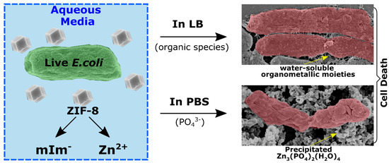 - Taheri, M.; Ashok, D.; Sen, T.; Enge, T.G.; Verma, N.K.; Tricoli, A.; Lowe, A.; Nisbet, D.R.; Tsuzuki, T. Stability of ZIF-8 nanopowders in bacterial culture media and its implication for antibacterial properties. Chem. Eng. J. 2021, 413, 127511. [Google Scholar] [CrossRef]