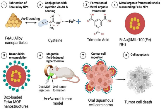 In a study by Dhawan et al., the hydrophobic drug Dox was encapsulated in a nanocarrier (FeAu@MIL-100). To fabricate FeAu@MOF nanostructures, nanoparticles of the FeAu alloy (FeAu NPs) were first prepared and then coated with MIL-100 (Fe) MOFs. They encapsulated Dox into the nanostructures and assessed how the platform worked for imaging and cancer theranostics. FeAu@MOF nanostructures exhibited superparamagnetism when stimulated with magnetic hyperthermia behavior and an alternating magnetic field (AMF) and showed Dox release and encapsulation efficiencies of 97.19 and 69.95%, respectively. AMF-induced hyperthermia resulted in the death of 90% of HSC-3 cells of OSCC according to in vitro assays, suggesting its potential use in cancer theranostics. Finally, FeAu@MOF nanostructures in an in vivo mouse model enhanced imaging contrast, decreased tumor volume by 30 times, and tumor weight by 10 times, enhancing cumulative survival and demonstrating the potential of this method for the treatment of oral cavity cancer [145] (See Figure 7).