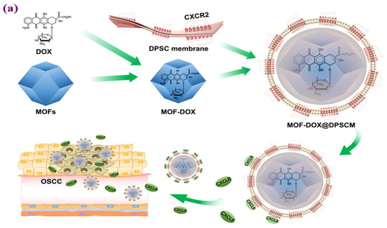 In another study, Zhou [116] and his colleagues developed MOF nanoparticles coated with membranes derived from dental pulp mesenchymal stem cells (DPSC) containing the CXCR2 receptor. It has been shown that MOF-Dox@DPSCM can carry Dox and be chemoattracted by chemokines such as CXCL8 released from OSCC, reducing OSCC rate growth in vitro and in vivo. Figure 8 shows a schematic of the application of DPSC membranes in conjunction with MOFs as a method for targeting OSCCs using MOFs. The release was measured at an acidic pH of 6.4. Flow cytometric analysis revealed that MOFs alone induced an apoptosis rate of 9.47% in CAL27 cells. In contrast, MOFDox@DPSCM induced 22.97% apoptotic CAL27 cells after 4 h of coculture. According to these experiments, the Dox in MOF-Dox@DPSCM effectively killed CAL27 and OSCC cells (Figure 8) [116].
