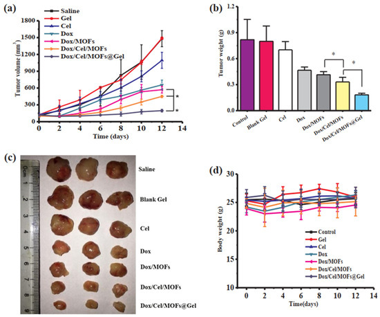 Schematic illustration of (h) a novel injectable metal-organic scaffold@thermosensitive hydrogel for local dual drug delivery during oral administration, Dox/Cel/MOFs@Gel Cancer Therapy. (a) Tumor volume change across all groups over 12 days. (b) The weight of the mice’s tumors after 12 days in each group. (c) An image of the tumors that were removed on day 12. (Data are expressed as the mean ± SD, * p < 0.05). (d) A measurement of mice’s average body weight taken 12 days after dosing [115], Copyright © 2023, Elsevier.
