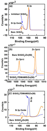 XPS Si 2p narrow scans of (a) bare Si\SiO2 and Si\SiO2\TDMAMS (inhibited Si\SiO2), (b) Zn 2p peaks of Si\SiO2 and Si\SiO2\TDMAMS after 50 ALD cycles of DMZ and water, and (c) Si 2p signals from the samples in (b). In these panels, the solid orange lines correspond to bare Si\SiO2, and the dotted blue lines correspond to Si\SiO2\TDMAMS.