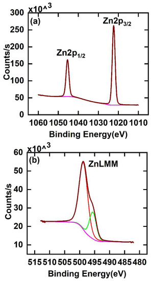 While it is often possible to determine the chemical states of elements by XPS, the Zn(0) and Zn(II) 2p3/2 peaks at 1021.4 and 1021.7 eV, respectively, are not widely spaced in energy, which makes chemical state speciation of Zn(0) or Zn(II) from this peak challenging [30]. Accordingly, to confirm the chemical state of zinc in this film, we calculated its modified Auger parameter. The Auger parameter was first introduced by Wagner as the kinetic energy (KE) of a specified photoemission peak subtracted from the KE of a specified Auger peak [31,32]. In many cases, it is both more sensitive to the oxidation states of elements and occurs over a wider range of energies than the positions and differences of corresponding photoemission signals. Auger peaks are often more sensitive to sample chemistry than photoemission peaks because they involve higher energy electrons, i.e., electrons closer in energy to those used for chemical bonding. Gaarenstroom and Winogard added the photon energy to the Auger parameter, which made it independent of the X-ray energy and removed the possibility of it returning negative values [33]. Their form of the Auger parameter is referred to as the modified Auger parameter. Because the modified Auger parameter is the difference between two signals, it is not generally affected by sample charging. To calculate the modified Auger parameter for Zn in our film, we found the positions of the Zn 2p3/2 and Zn LMM signals by fitting them in CasaXPS [34,35] with asymmetric Lorentzian (LA) functions (see Figure 4) [35,36]. The modified Auger parameter was then obtained from Equation (2):