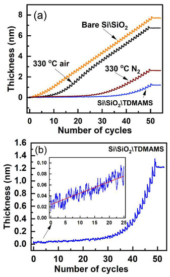 To assess the inhibitory effects of TDMAMS in ALD, ALD of ZnO was followed by in situ ellipsometry on Si\SiO2\TDMAMS and bare Si\SiO2. On the unmodified surface (see Figure 5a), there is an induction period of slower growth during the first 5–10 cycles followed by steady, consistent thin-film growth. In contrast, on Si\SiO2\TDMAMS, only minimal growth of ZnO takes place during the first 30–35 ALD cycles. Not even 0.1 nm of ZnO has been deposited on Si\SiO2\TDMAMS after 30 DMZ-water cycles. These results suggest that TDMAMS interferes with and inhibits ALD of ZnO from DMZ and water. This inhibition is probably a result of the low silanol concentration on the Si\SiO2\TDMAMS surface [13], i.e., there are few reactive groups/sites where reaction with DMZ can occur. Furthermore, the relatively few silanols on the Si\SiO2\TDMAMS surface may be sterically hindered/inaccessible. Nevertheless, an enlarged view of the in situ ellipsometry of the ALD of ZnO on Si\SiO2\TDMAMS suggests very slow, linear growth of ZnO for the first ca. 25 ALD cycles (Figure 5b). In other words, ZnO is being slowly deposited on Si\SiO2\TDMAMS. After ca. 30 ALD cycles, ZnO deposition takes place in a more noticeable way. The results in Figure 5 showcase the value of in situ ellipsometry in ALD.