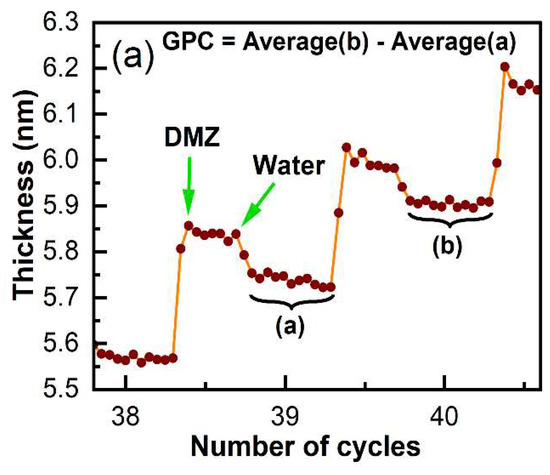 (a) An enlarged view of a portion of the in situ ellipsometry results in Figure 5a for the ALD of DMZ and H2O on bare Si\SiO2 showing an example of the determination/calculation of the growth per cycle (GPC). (b) The GPC values for the ALD of DMZ and H2O on bare Si\SiO2. The red line through the data is a guide for the eye. The parameter is defined as the average GPC at and beyond 20 cycles where growth is nearly constant.