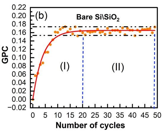 The growth per cycle (GPC) is an important figure of merit for ALD. Figure 6a shows a representative example of how we calculated the GPC from our in situ ellipsometry results, and Figure 6b shows the GPCs for all the cycles in the deposition of DMZ and H2O on bare Si\SiO2 in Figure 5a. As shown in Figure 6b, the GPC for the ALD of ZnO on bare Si\SiO2 plateaus after 20 cycles (and maybe after 15). We define the parameter for our deposition as the average GPC at and beyond 20 cycles in Figure 6b. All the results in Figure 5a were then normalized to to yield the normalized GPCs shown in Figure 7a. This representation of the information appears to facilitate its interpretation. First, since the normalized GPCs for bare Si\SiO2 in Figure 7a were obtained from a parameter derived from the same set of data, they do not fundamentally change, except in scale. The normalized GPCs for Si\SiO2\TDMAMS that was stressed/damaged by heating to 330 °C for 20 min in the air are more interesting. They show (i) an induction period for the first ca. 18 cycles, (ii) a region of accelerated growth up to ca. cycle 32 that is indicative of island growth where the substrate surface area is higher than after island coalescence (this type of growth is commonly observed in substrate-inhibited ALD [22]), and (iii) a normalized GPC value for the deposition approximately equal to thereafter, which suggests that island coalescence has taken place at this point. Finally, the GPC of the Si\SiO2\TDMAMS surface that was stressed/damaged by heating to 330 °C in N2 reaches after ca. 47 cycles, while the unstressed Si\SiO2\TDMAMS surface has still not reached at 50 ALD cycles.