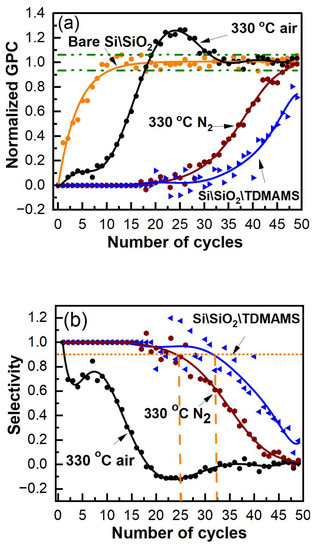 where and are the amounts of deposited material on the growth and non-growth surfaces, respectively. Depending on the deposition method, θ can be calculated by different methods including scanning electron microscopy (SEM), transmission electron microscopy (TEM), atomic force microscopy (AFM), SE, or barriers/energy differences from computational studies [24]. Higher selectivity is always desirable. Finally, in addition to showing the selectivity as a function of the number of ALD cycles, the normalized growth per cycle was plotted. This representation of the data appears to effectively identify some of the important regimes in film growth and inhibition in AS-ALD.