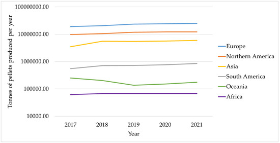 Production of pellets in the various continents from 2017 to 2021 [32]. The y-axis is logarithmic to account for the high variability in production in the various continents.