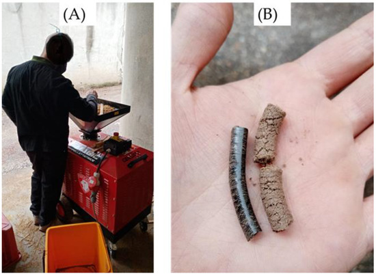 (A) Small-scale pellet production. (B) High- (on the left) and low-quality (on the right) pellets.