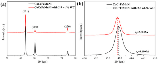 (a) X-ray diffraction patterns of CoCrFeMnNi and CoCrFeMnNi with 2.5 wt.% WC samples, (b) partial enlargement of the XRD pattern in (a).