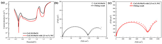 (a) Potentiodynamic polarization curves and electrochemical impedance spectroscopy of (b) CoCrFeMnNi and (c) CoCrFeMnNi with 2.5 wt.% WC in 0.5 M H2SO4 solution.