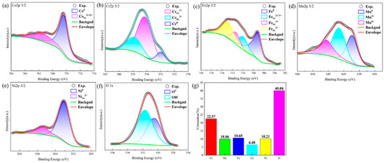 High resolution XPS spectra of the passive films formed on the CoCrFeMnNi after dynamic potential polarization curve test in 0.5 M H2SO4 solution (a) Co, (b) Cr, (c) Fe, (d) Mn, (e) Ni, (f) O, (g) elemental fractions in the passive film of HEA obtained by XPS analysis.