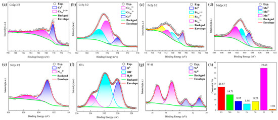 High resolution XPS spectra of the passive films formed on the CoCrFeMnNi with 2.5 wt.% WC after dynamic potential polarization curve test in 0.5 M H2SO4 solution (a) Co, (b) Cr, (c) Fe, (d) Mn, (e) Ni, (f) O, (g) W; (h) elemental fractions in the passive film of HEA obtained by XPS analysis.