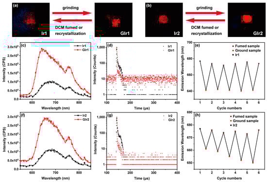 (a,b) Photographs of Ir1/GIr1 and Ir2/GIr2 upon irradiation with UV light. (c,f) Emission spectra of complexes Ir1, GIr1, Ir2, and GIr2 in solid states (the emission peak at ca. 750 nm may be caused by the laser). (d,g) Decay curves of complexes Ir1, GIr1, Ir2, and GIr2 in solid states. (e,h) Cycles of mechanochromism of Ir1 and Ir2. The letter “G” represents ground samples.
