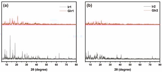 In order to realize the possible origin of the MCL behaviors of these two compounds, the powder X-ray diffraction (PXRD) tests were carried out on the as-synthesized sample and ground sample. As illustrated in Figure 4, the intense and sharp reflection peaks can be observed in Ir1 and Ir2, suggesting that these two complexes are well-ordered and crystalline in nature. Moreover, the ground samples showed a weaker diffraction signal, suggesting that the original ordered structures were destroyed. Furthermore, the results showed that the crystallinity of Ir1 is higher than that of Ir2; thus, Ir1 showed an obvious blue-shift compared with Ir2 after being ground. In other words, MCL behaviors of the two iridium(III) complexes may be due to the phase transition from crystalline to amorphous states.