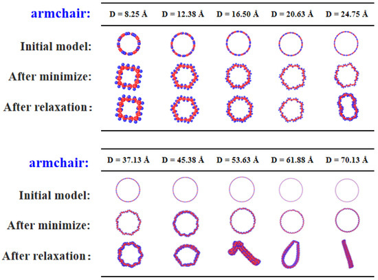 Evolution of cross-sectional geometry of armchair PNTs with diameter (ranging from 8.25 Å to 70.13 Å). For each case, the initially constructed atomic model, the structure after energy minimization, and those after structural relaxation at 1 K are provided.