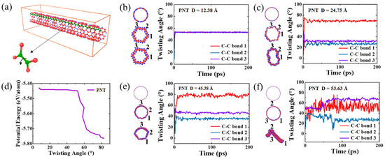 Twisting of zigzag carbon chains in armchair PNTs (a). The potential energy of the system decreases as a result of twisting (d). (b,c,e,f) present selected twisting angle evolution as a function of time for PNTs with different diameters.