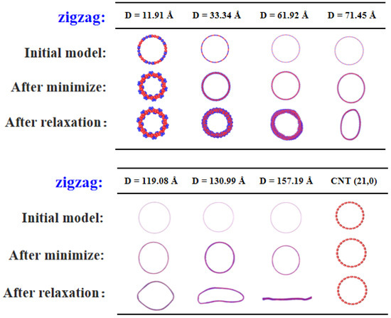 Evolution of cross-sectional geometry of zigzag PNTs with varying diameter (ranging from 8.25 Å to 157.19 Å). For each case, the initially constructed atomic model, the structure after energy minimization, and those after structural relaxation at 1 K are provided. The structures of a finite sized zigzag CNT are also provided on the lower right panel for comparison.