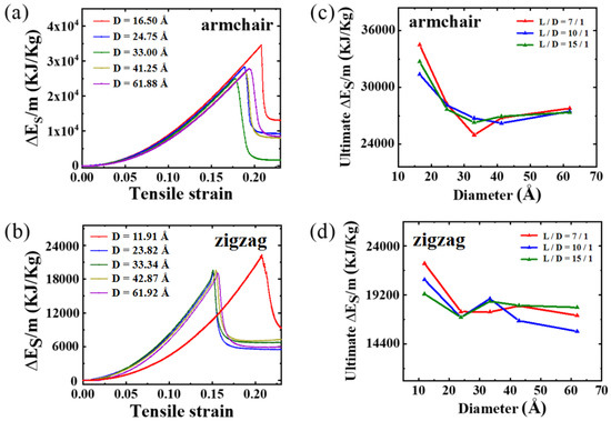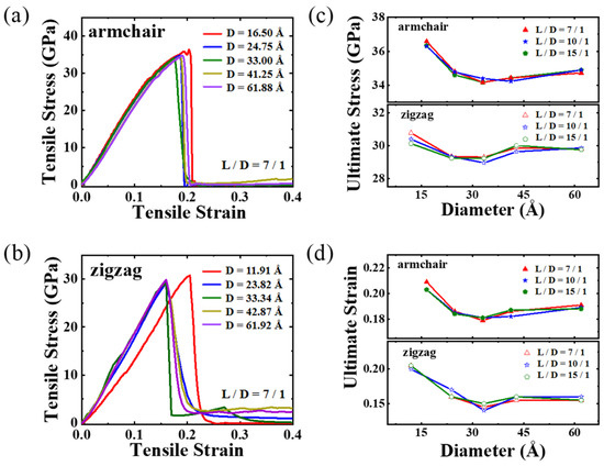 Mechanical properties of PNTs under tensile loadings. (a,b) show stress–strain relationship for armchair and zigzag PNTs with aspect ratio of 7/1, the ultimate stress and ultimate strain are plotted in (c,d) as a function of diameter.