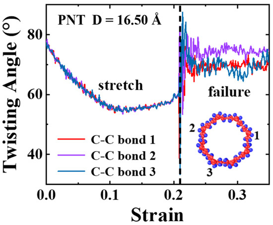 Figure 5c,d display the extracted ultimate stress and strain from the stress–strain curves, revealing that the aspect ratio has no considerable impact on the ultimate stress and strain of the PNTs. The diameter, on the other hand, plays a crucial role. The ultimate strain demonstrates a decreasing trend with an increasing diameter until it converges, with the ultimate stress displaying similar behavior. This reason is due to two aspects: firstly, as discussed earlier, PNTs contract at small diameters, facilitating deformation under tension; secondly, carbon chain twisting sensitivity varies according to the tube diameter. For small-diametered PNTs, the degree of twisting is stronger (up to 80°), leading to the untwisting of carbon chains under tensile loading. Figure 6 represents a typical result obtained from a D = 16.50 Å PNT. The twist angle steadily drops from 80° to 55° as the tensile strain rises to 12%. It then remains relatively stable before the breaking point when a failure transpires at a strain level of 21%, demonstrating an almost complete fracture of the PNTs since the twist angles fluctuate and return to values near the original ones. The immediately fractured structures of both armchair and zigzag PNTs are shown in Figure 7, where brittle failure mode is clearly seen.