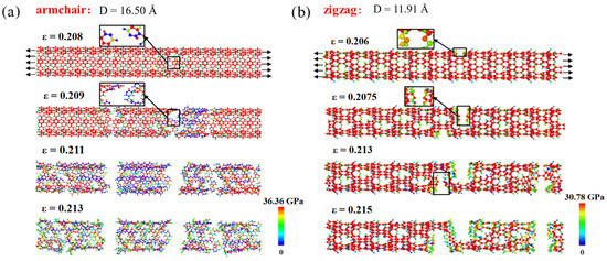 Failure process of PNTs under tensile loadings. The stress distribution for each PNT is provided and the stress level can be referred to the color bars. (a) armchair PNTs; (b) zigzag PNTs.