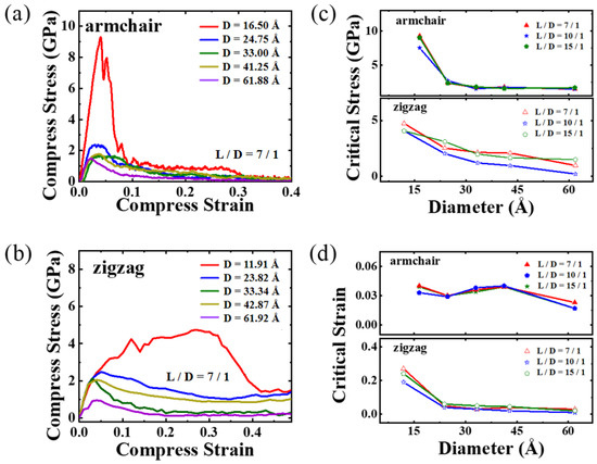 PNTs under compressive loadings. (a,b) show the stress–strain relationship for the armchair and zigzag PNTs. The critical stress and critical strain for buckling are shown in (c,d).