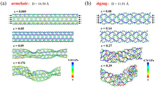 Buckling process of PNTs under compression. The stress distribution for each PNT is provided and the stress level can be seen from the color bars. (a) buckling process of an armchair PNT with D = 16.5 Å, (b) buckling process of a zigzag PNT with D = 11.91 Å.